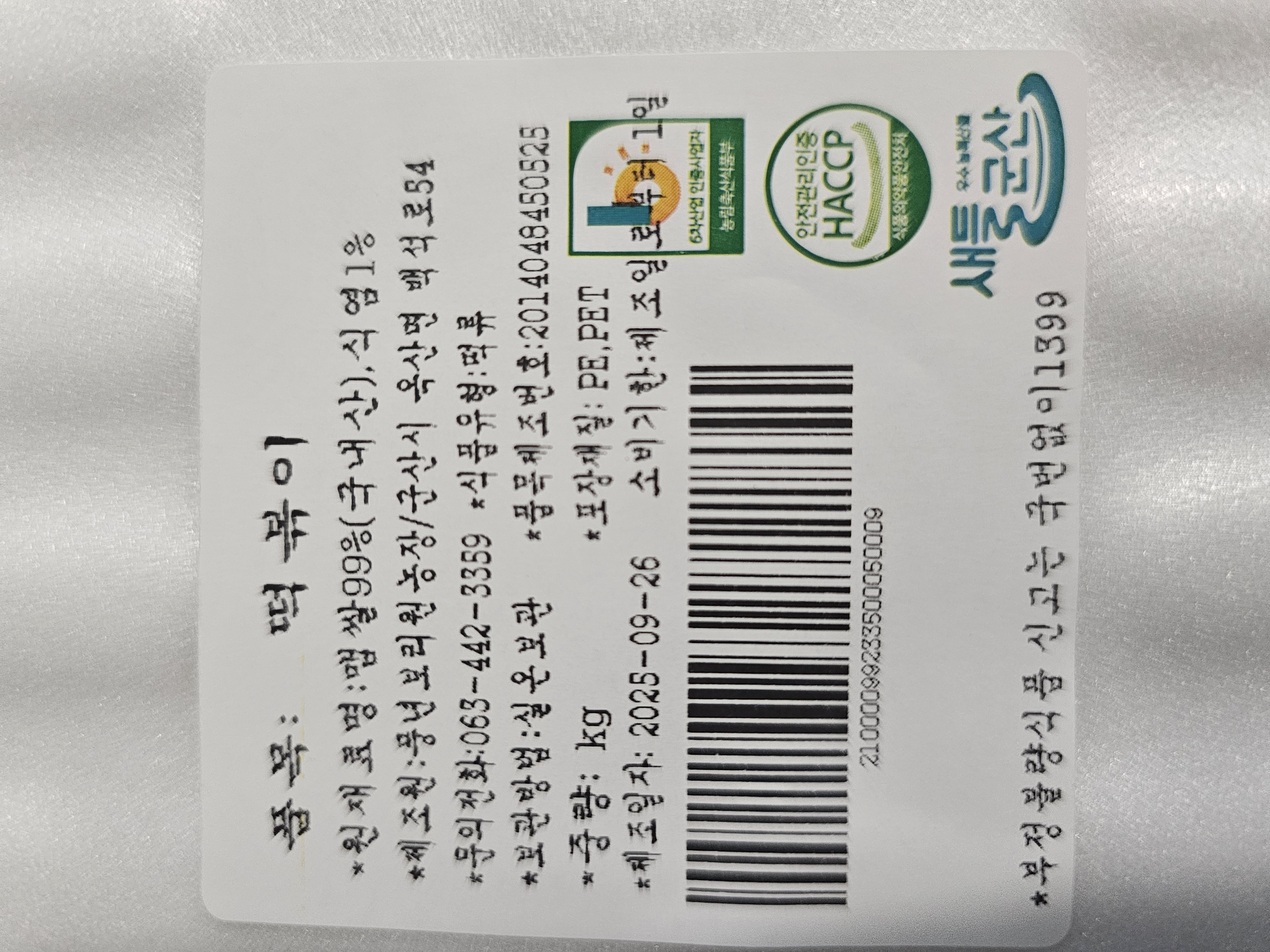 원료명 및 함량 | 맵쌀99%(국내산), 식염1% |
