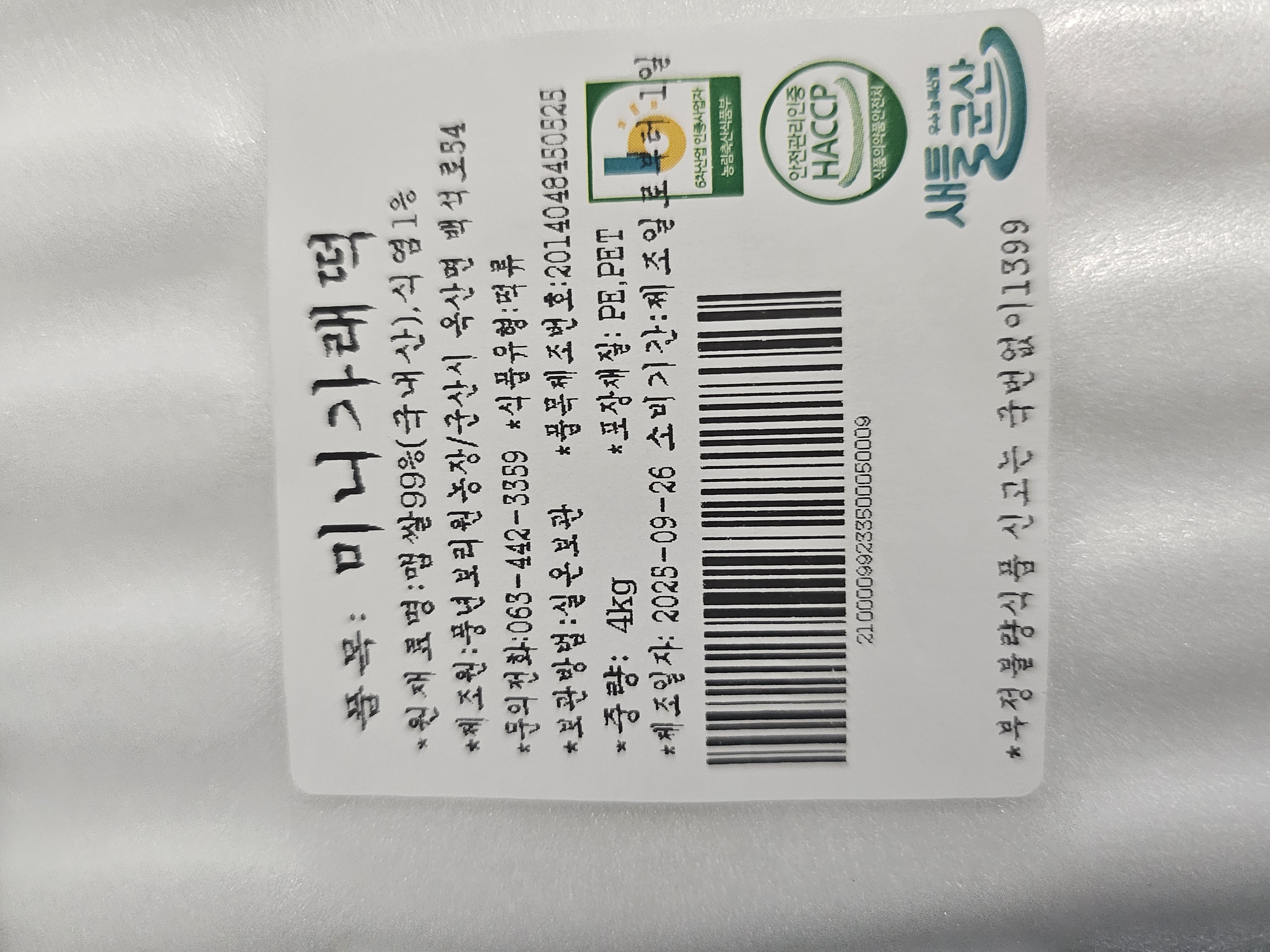 제품명 | 미니가래떡 | 소비기한 | 제조일로부터 1일 |